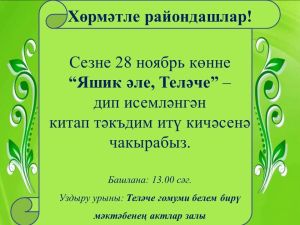 Хөрмәтле райондашлар, бүген сезне, Теләче урта мәктәбенә «Яшик әле, Теләче» дип исемләнгән китап тәкьдим итү кичәсенә чакырабыз.